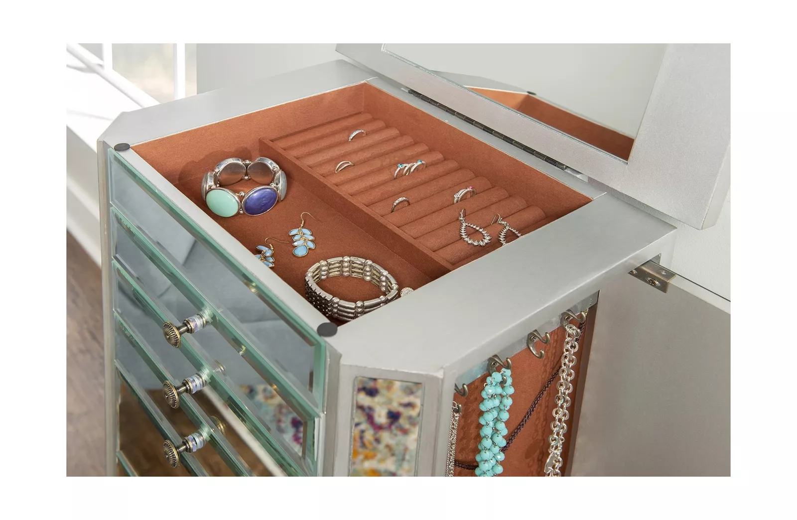 Silver Wood Mirrored-Finish Jewelry Armoire